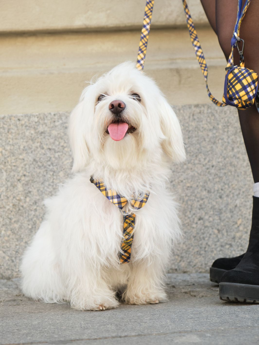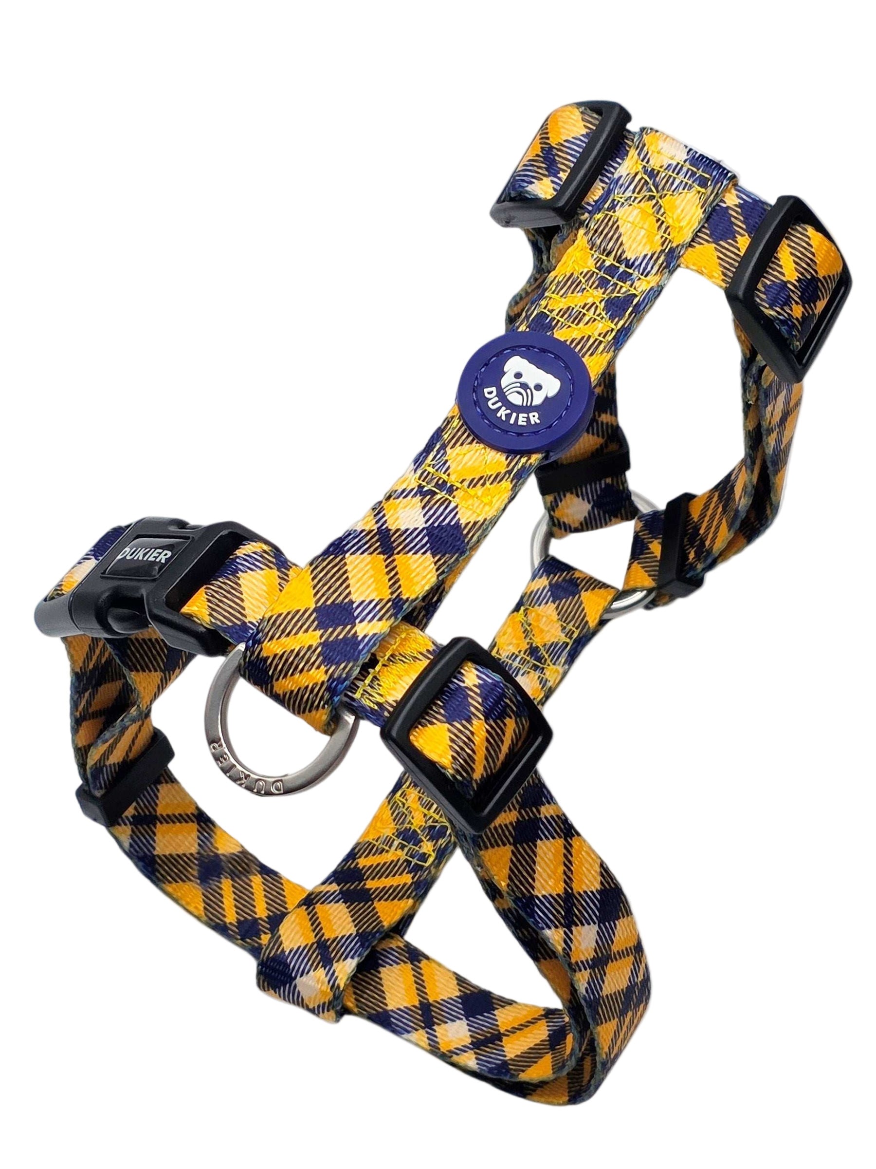 Produzido com materiais macios e resistentes, este arnês ajusta-se no pescoço e no peito, proporcionando um encaixe preciso e confortável. O design xadrez Mostarda confere um acabamento moderno, alinhado com a restante coleção Dukier.
