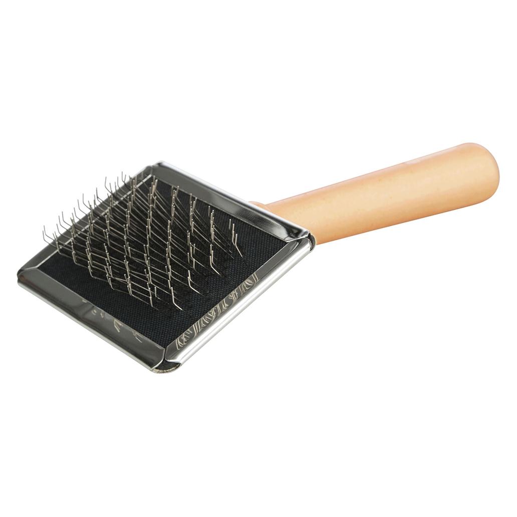 A Cardadeira Macia + Limpa Escova proporciona um cuidado suave e eficaz do pêlo superior e do sub-pêlo. Com pega em madeira e cerdas metálicas extra macias, remove pêlos soltos sem irritar a pele. Inclui um pente prático para limpar as cerdas após o uso.