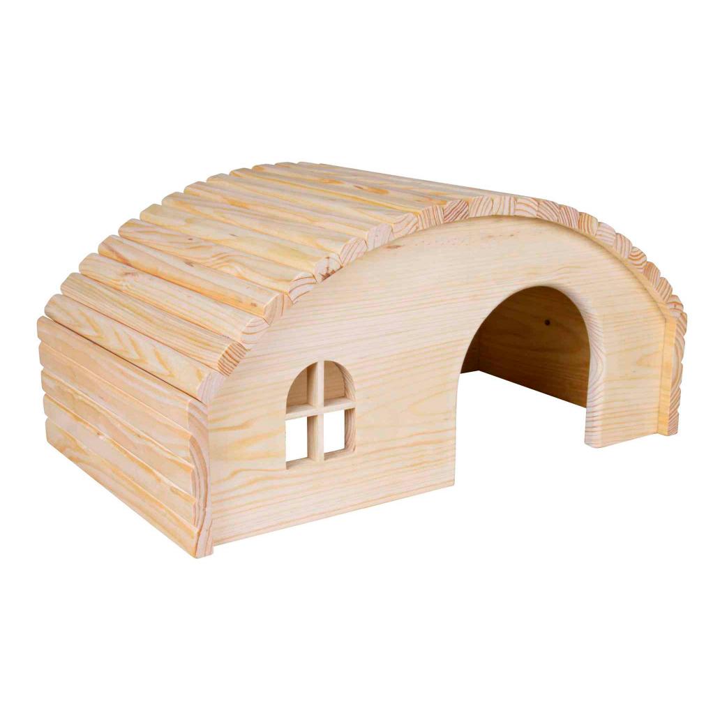 A casa em madeira de pinho para roedores oferece um refúgio confortável e seguro, ideal para descanso e abrigo de coelhos anões e porquinhos-da-Índia.