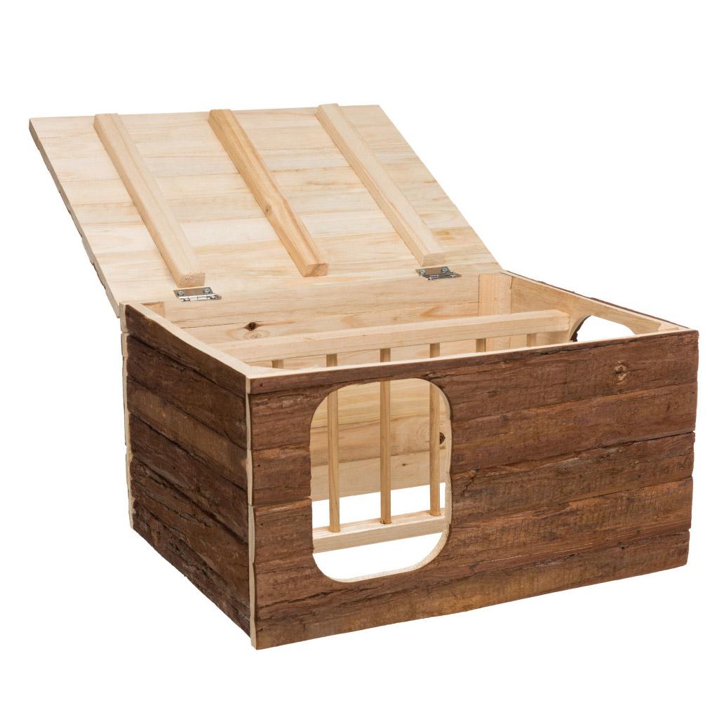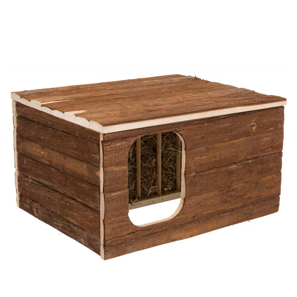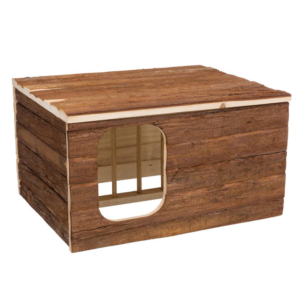 A casa Hilke em madeira natural é ideal para coelhos e porquinhos-da-Índia, combinando abrigo, descanso e alimentação num único espaço funcional.