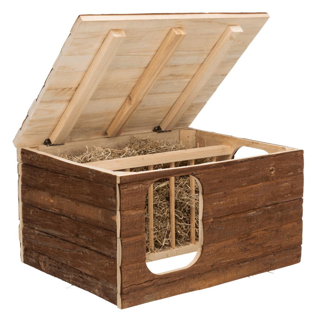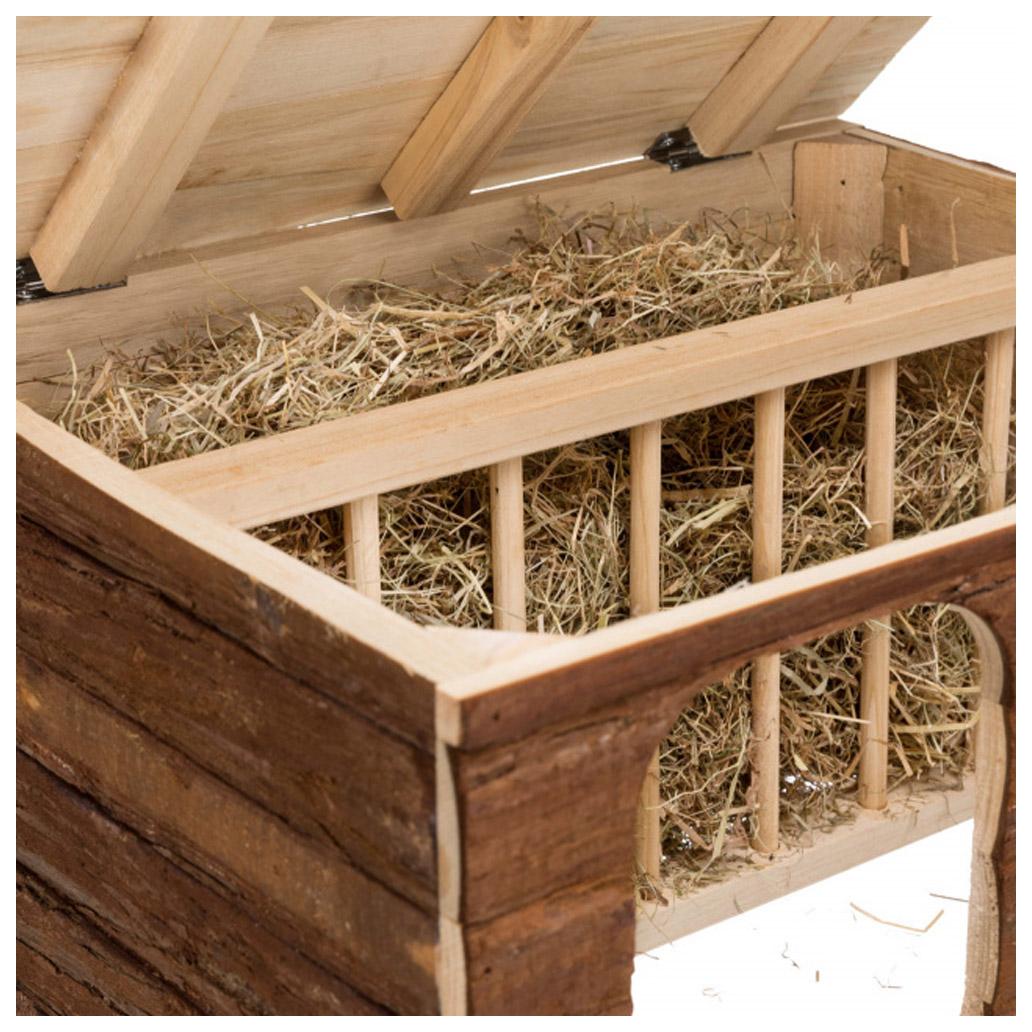 Fabricada em madeira natural, com telhado e orifícios de saída elevados para evitar que o feno seja retirado da casa. Facilita a limpeza e organização do espaço.