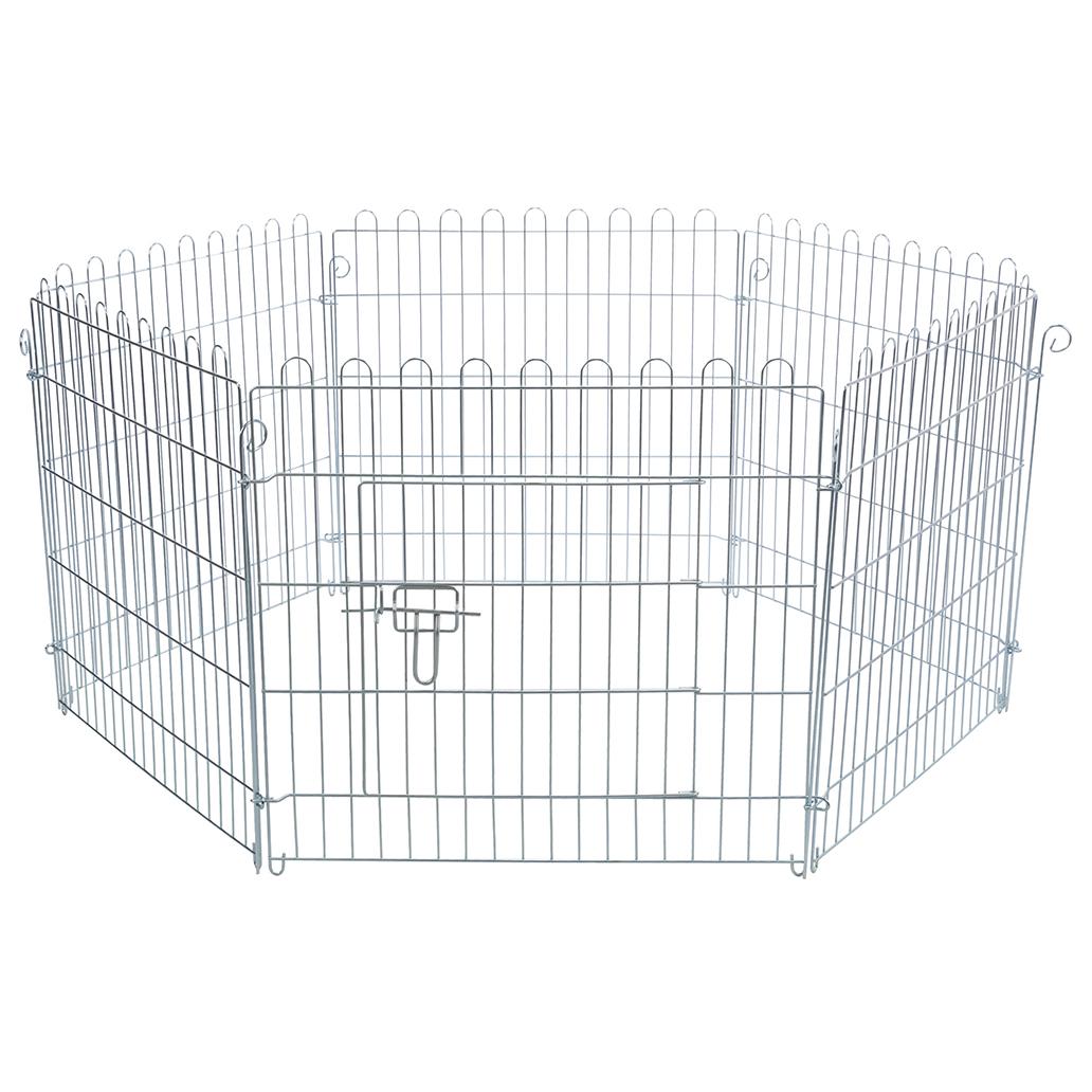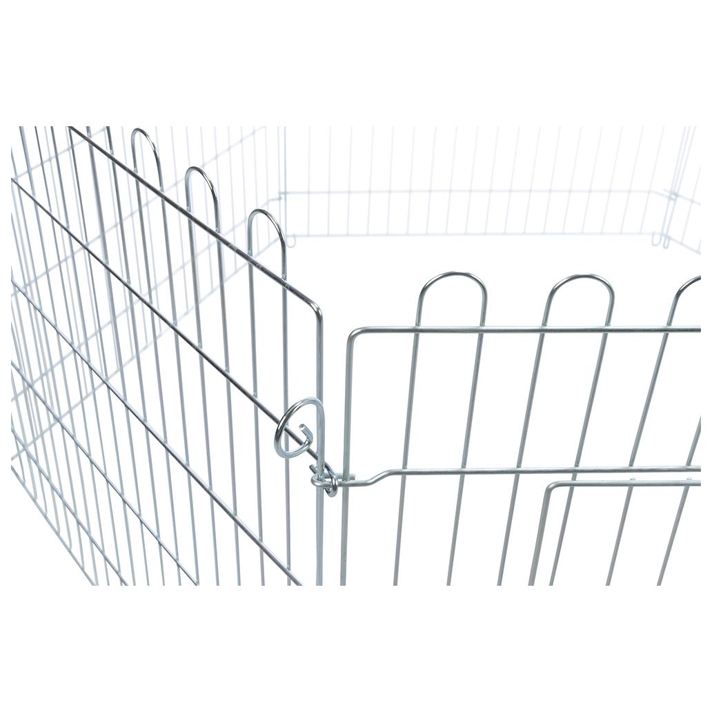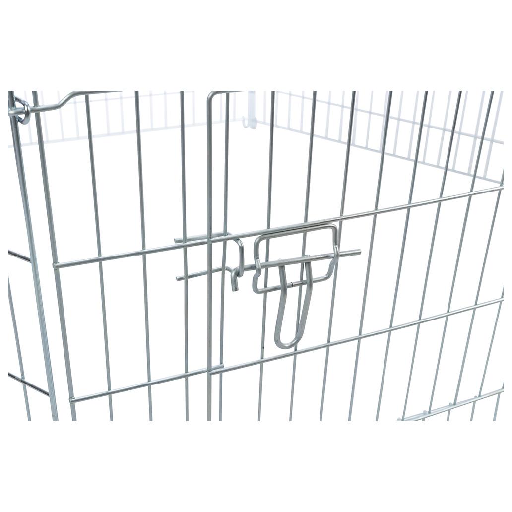 Estrutura em metal galvanizado resistente, com porta integrada para acesso fácil. Dimensões do recinto montado: diâmetro de 126 cm e altura de 58 cm.